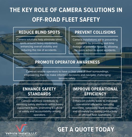 Contact Vehicle Installs today to discover how our specialized camera installation services can elevate your off-road fleet operations and drive success in challenging environments. Partner with us to embrace the future of off-road fleet management with innovative heavy equipment camera solutions.